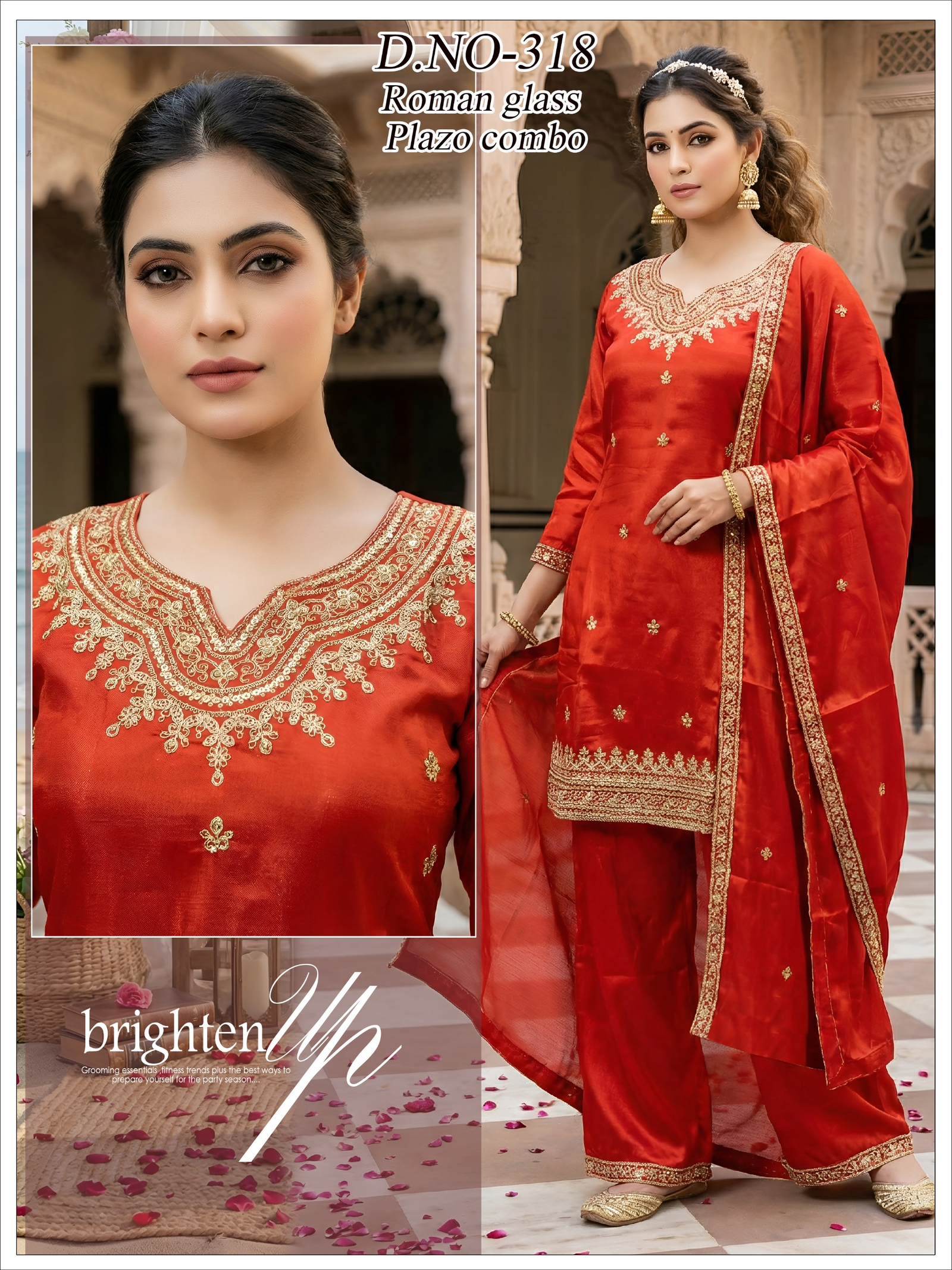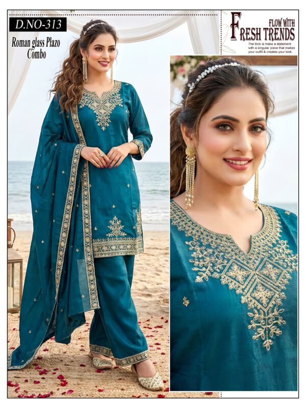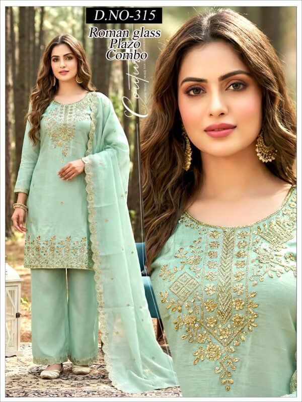 Crafted in premium Roman glass fabric, this outfit features *heavy coding embroidery work* that adds a rich and classy vibe.
